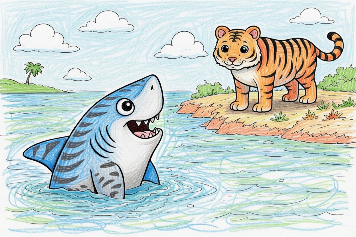 Printable coloring page for kids and toddlers showing a tiger shark in the water looking at a tiger on the shore. Big shapes and bold outlines make this fun and easy for preschool coloring.