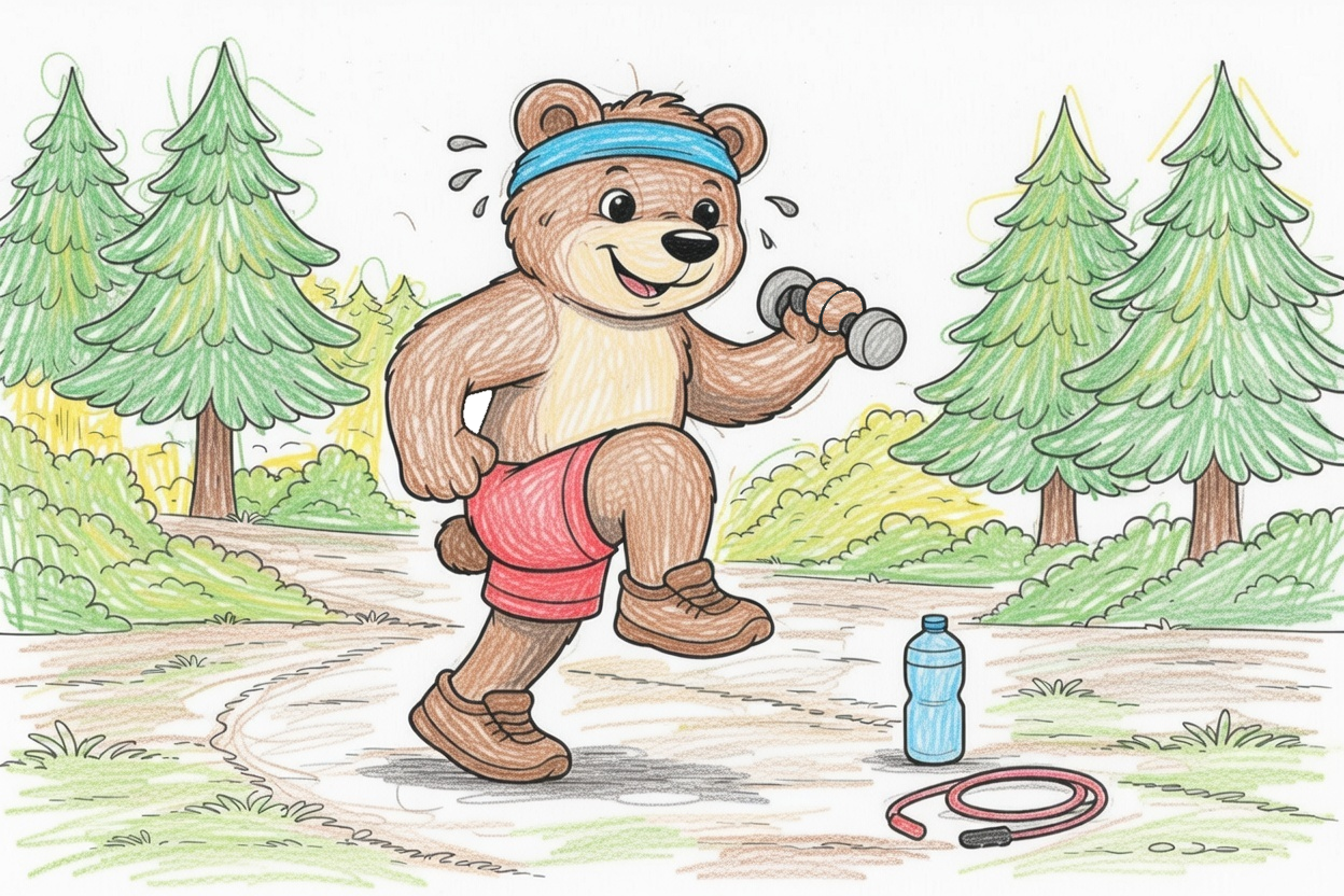 Printable coloring page for kids and toddlers showing a sporty bear training in the forest with a dumbbell. Simple shapes and bold outlines make it easy and fun for preschool coloring.