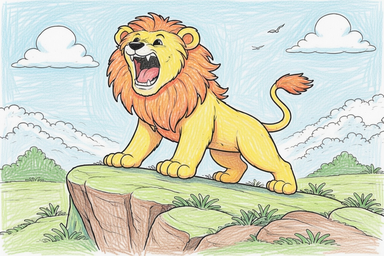 Printable coloring page for kids and toddlers showing a lion standing on a cliff and roaring loudly. Big shapes and bold outlines make it easy and fun for preschool coloring.