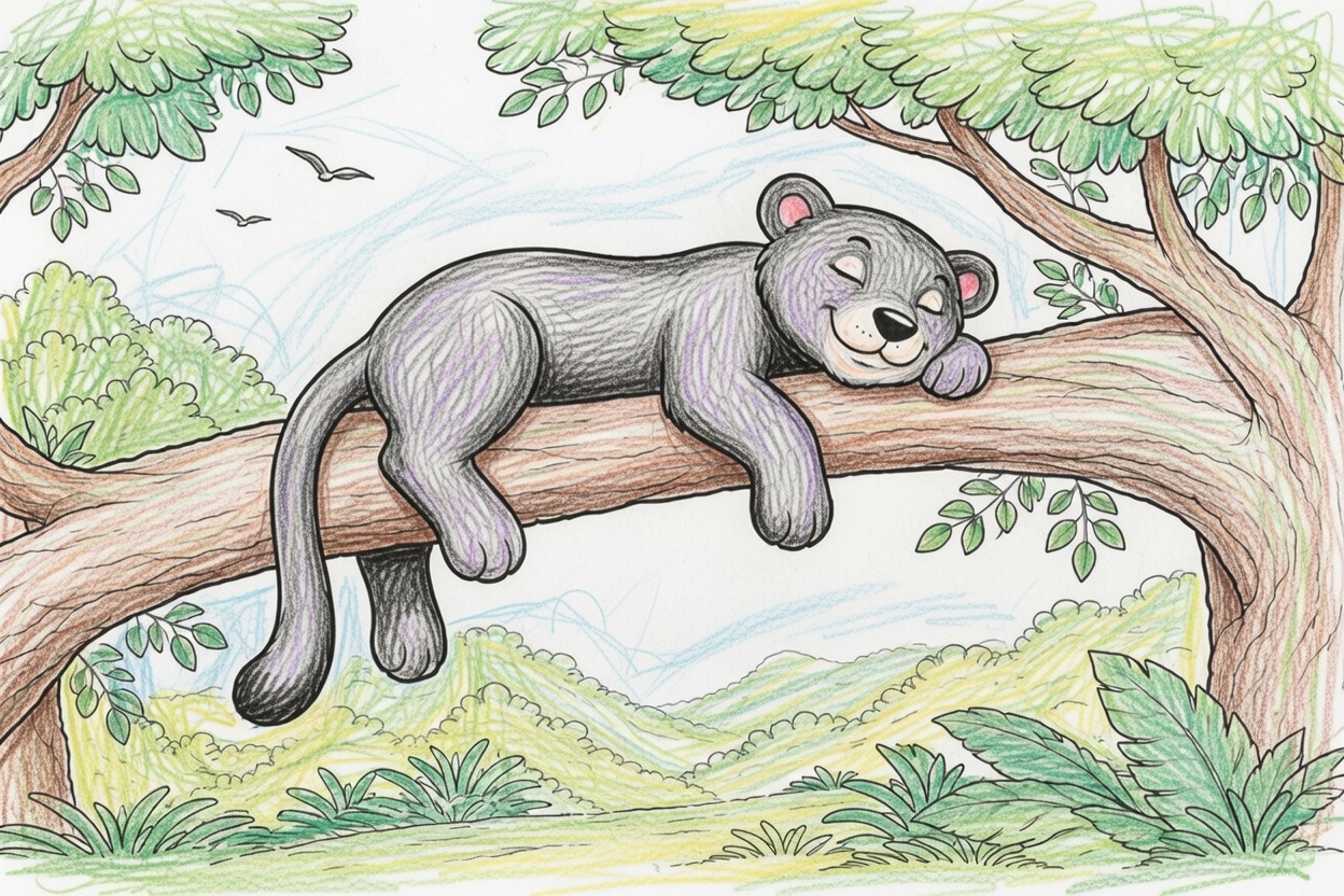 Printable coloring page for kids and toddlers showing a calm panther sleeping on a tree branch. Big shapes and bold outlines make it easy and relaxing for preschool coloring.