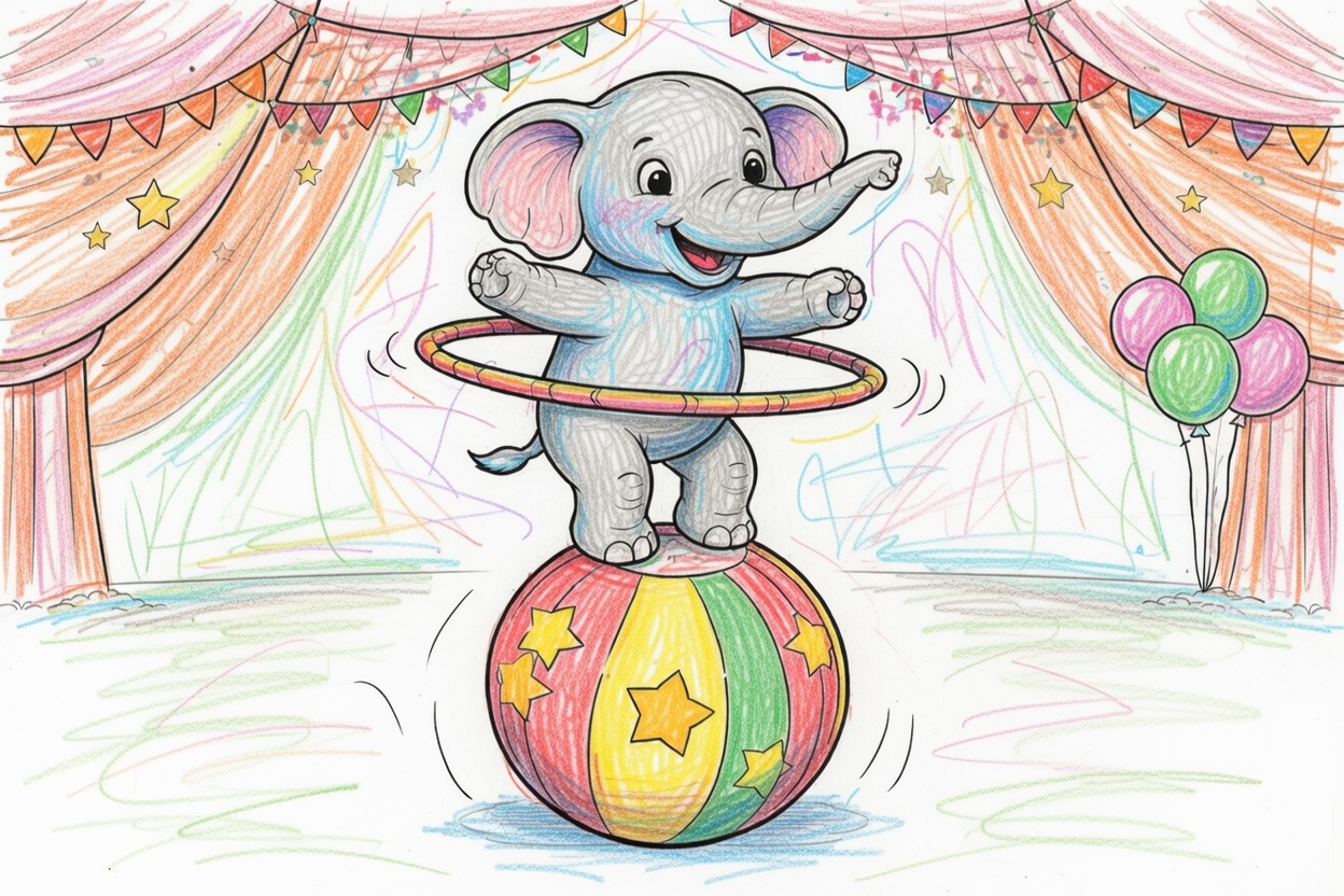 Printable coloring page for kids and toddlers with a baby elephant spinning a hoop while standing on a big ball in the circus. Bold outlines and simple shapes make it easy for preschool coloring.