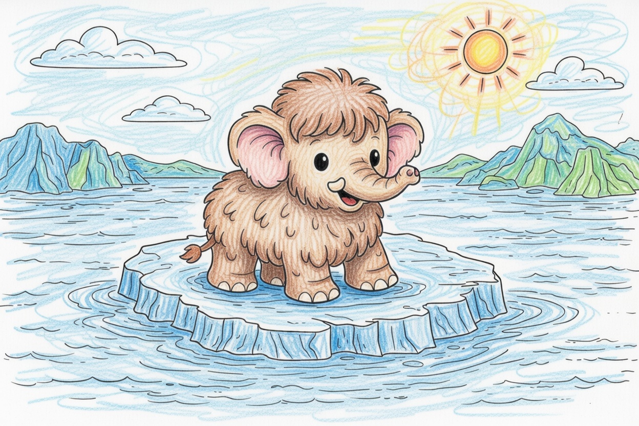 Printable coloring page for kids and toddlers showing a cute baby mammoth floating on an ice floe. Big shapes and bold outlines make this simple winter coloring page easy to color.