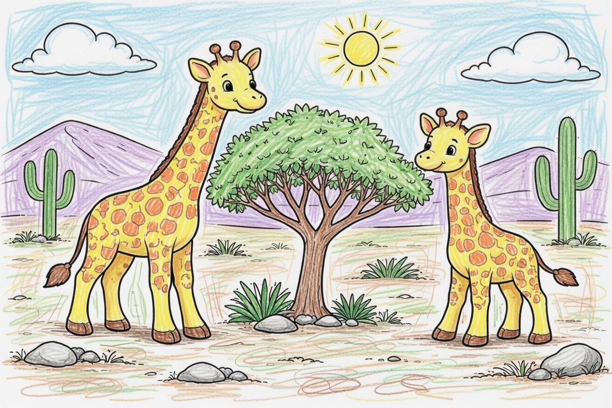 Printable coloring page for kids and toddlers showing two friendly giraffes standing near a small tree in the desert. Simple shapes and bold black outlines make it easy for preschool coloring.