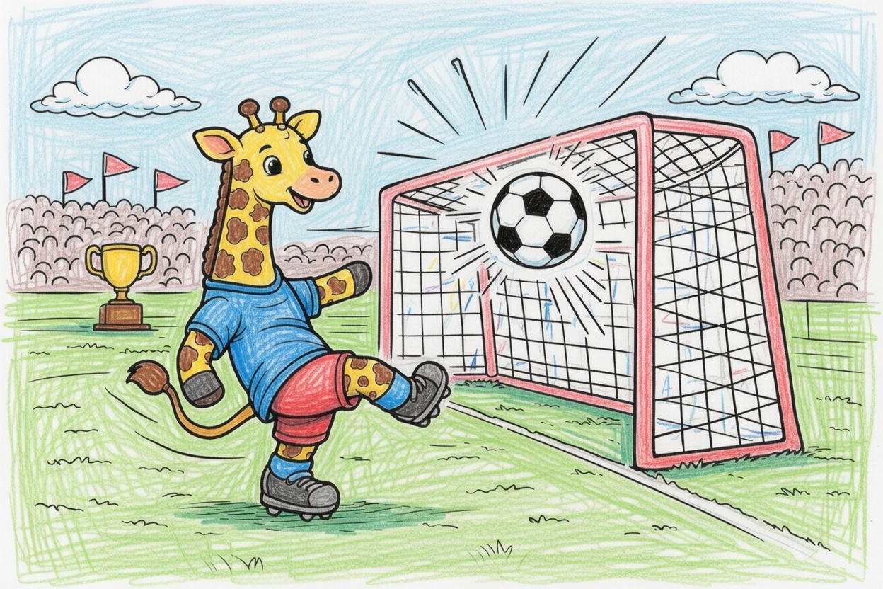 Printable coloring page for kids and toddlers showing a happy giraffe soccer player kicking the final goal into the net. Bold outlines and simple shapes make it easy and fun for preschool coloring.