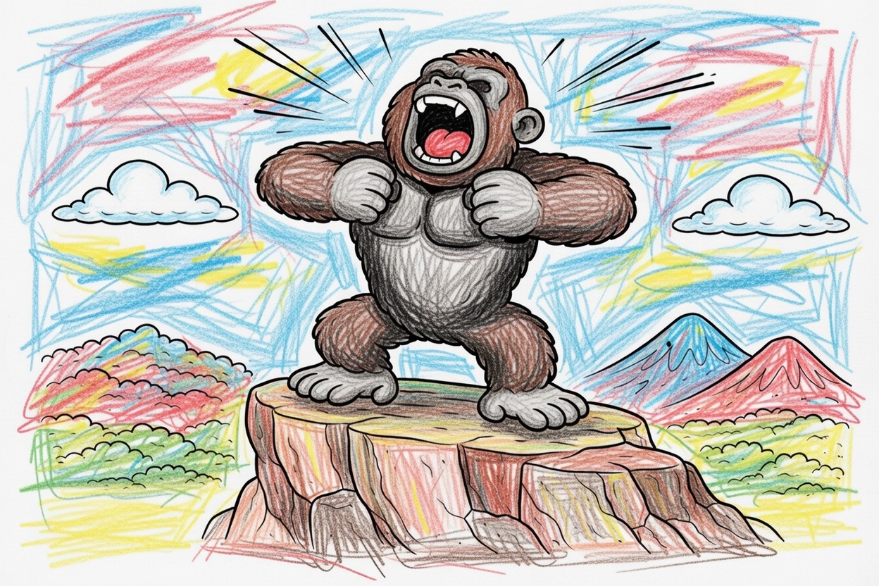 Printable coloring page for kids and toddlers showing a strong gorilla standing on a cliff and beating its chest. Big shapes and bold outlines make it easy and safe for preschool coloring.