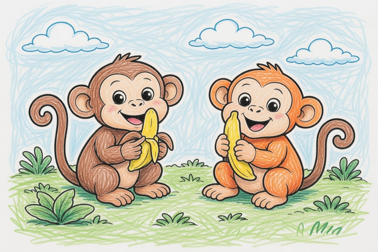Printable coloring page for kids and toddlers with two cute monkeys holding bananas. Big shapes and bold outlines make this simple picture perfect for ages 1–5.