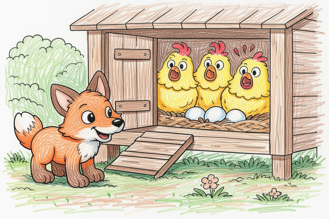 Printable coloring page for kids and toddlers with a clever fox looking into a chicken coop with scared chickens inside. Simple shapes and bold outlines make it easy and fun for preschool coloring.