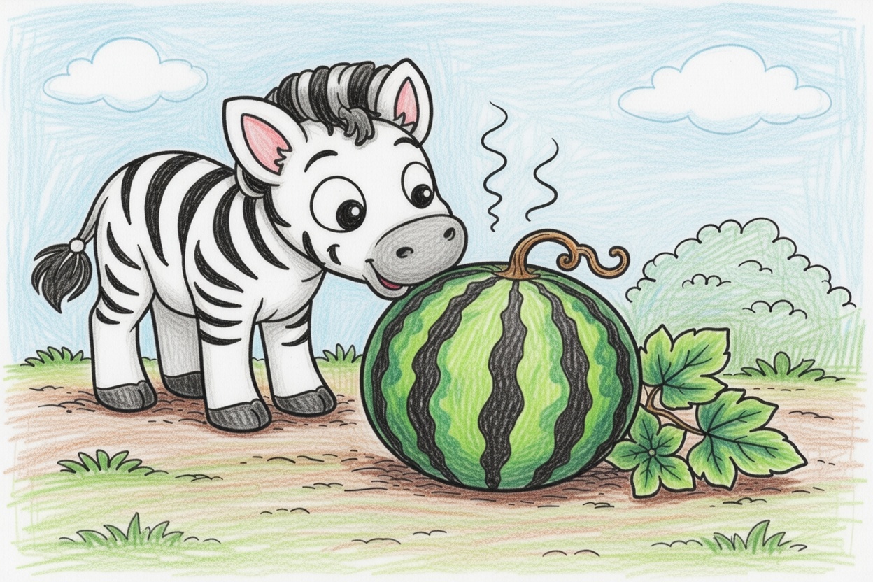 Printable coloring page for kids and toddlers showing a surprised zebra sniffing a big watermelon. Simple shapes, bold black lines, and large spaces make it perfect for ages 1–5.
