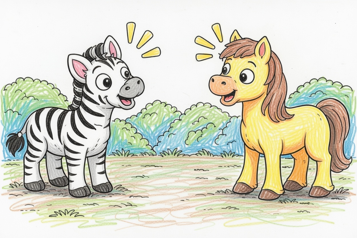 Printable coloring page for kids and toddlers showing a surprised zebra and a horse looking at each other. Big shapes, bold lines, and a simple ground and bushes make it perfect for ages 1–5.