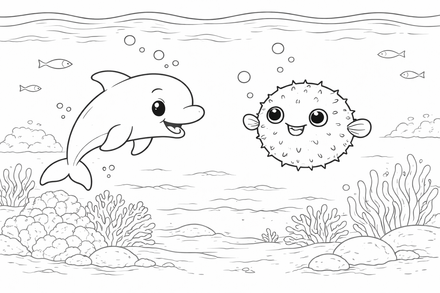 Curious Baby Dolphin and Pufferfish Coloring Page
