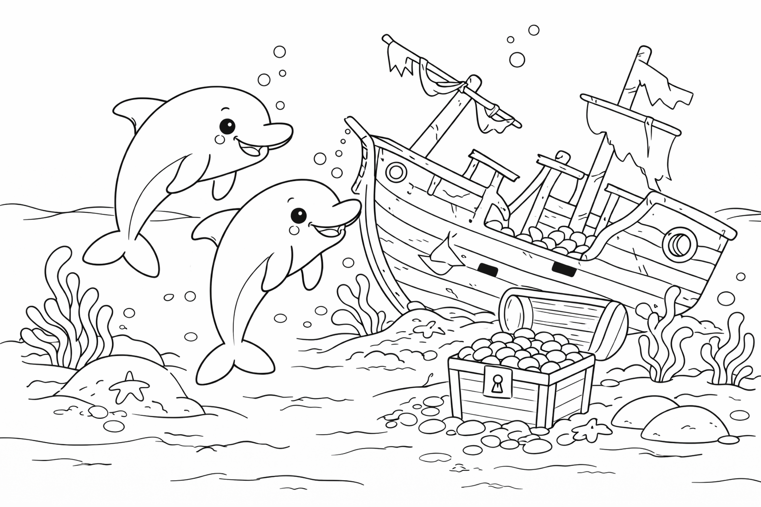 Dolphins and Sunken Treasure Coloring Page