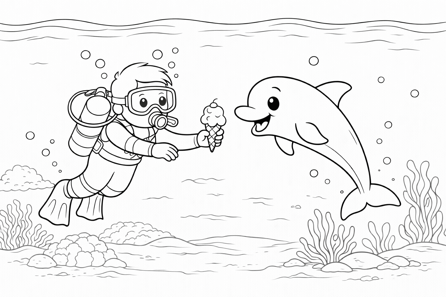Scuba Diver and Baby Dolphin Coloring Page