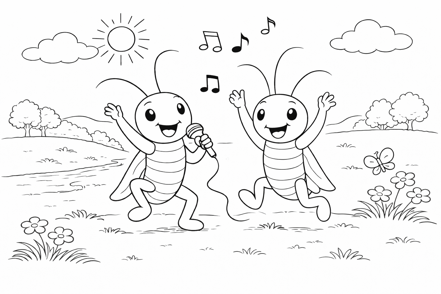 Happy Crickets Dancing and Singing Coloring Page