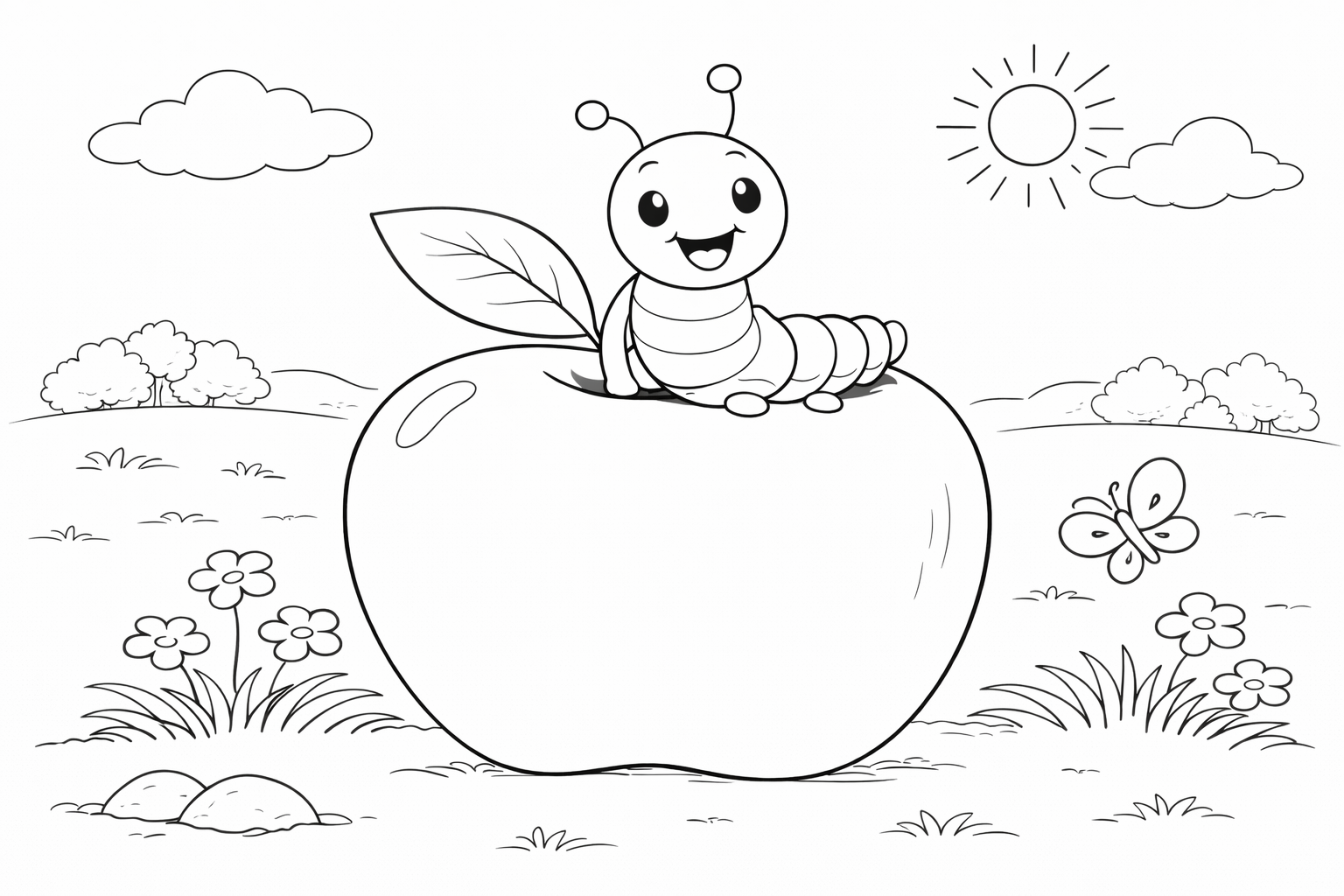 Happy Caterpillar on an Apple Coloring Page