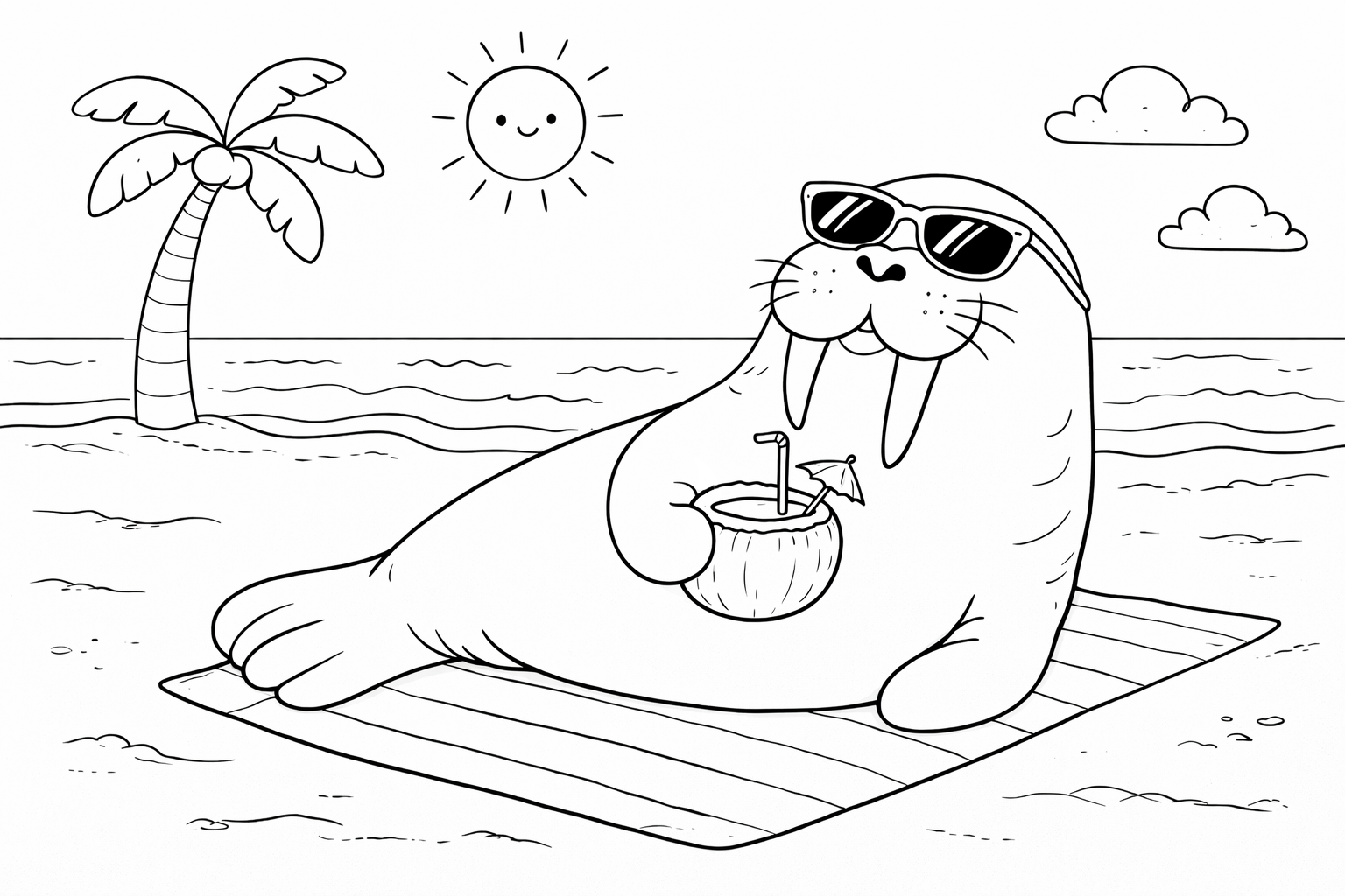 Relaxing Walrus on the Beach Coloring Page