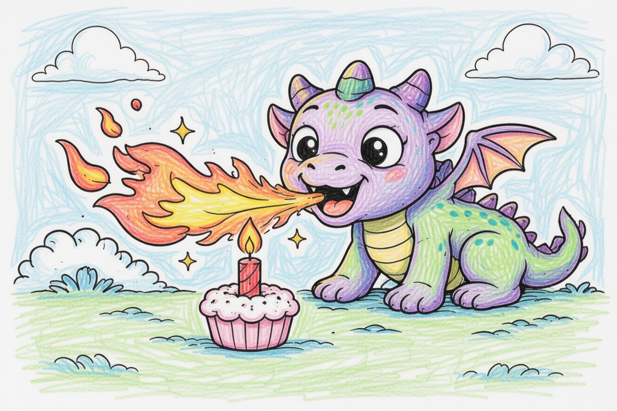 Printable coloring page for kids and toddlers showing a cute baby dragon breathing fire toward a candle. Big shapes and bold lines make it simple and fun for ages 1–5.