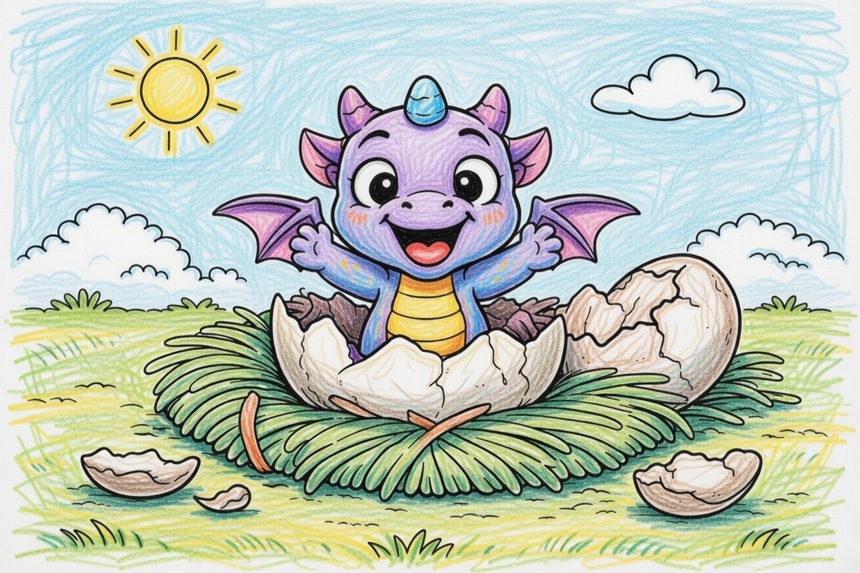 Printable coloring page for kids and toddlers showing a happy baby dragon just hatched from its egg. Big shapes, bold lines, and a simple scene make it perfect for ages 1–5.