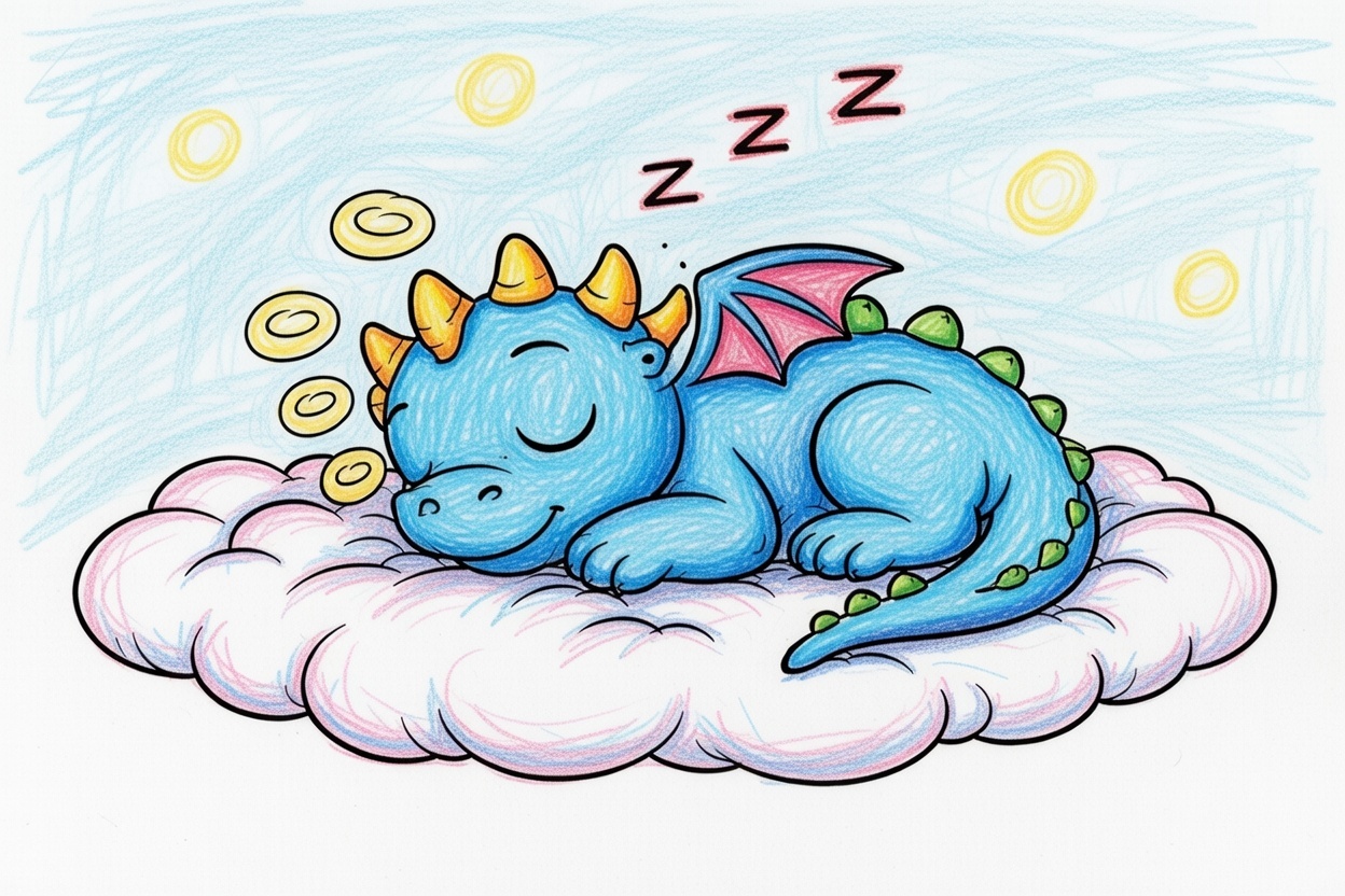 Printable coloring page for kids and toddlers showing a small dragon sleeping sweetly and blowing little smoke rings from its nose. Bold lines and simple shapes make it perfect for ages 1–5.