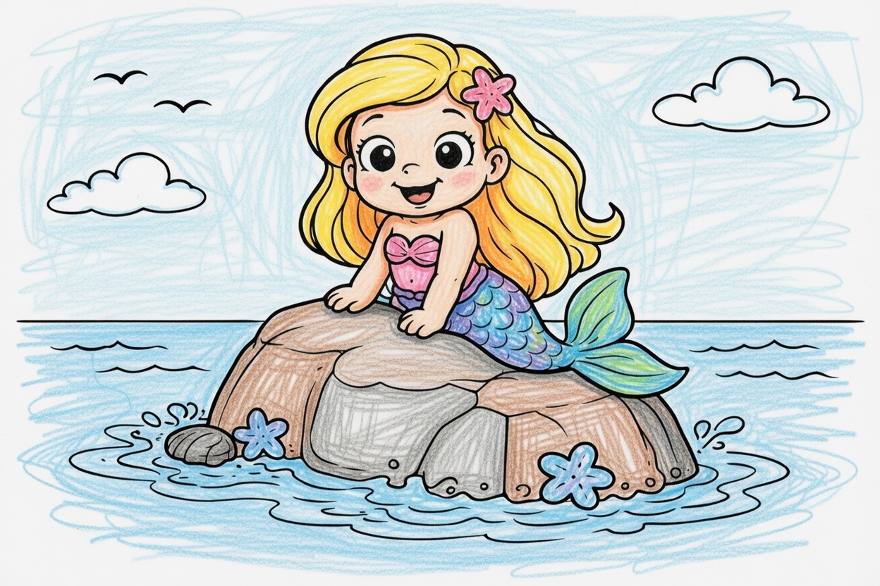 Printable coloring page for kids and toddlers with a cute mermaid sitting on a rock in the sea. Bold black lines and simple shapes make it perfect for ages 1–5.