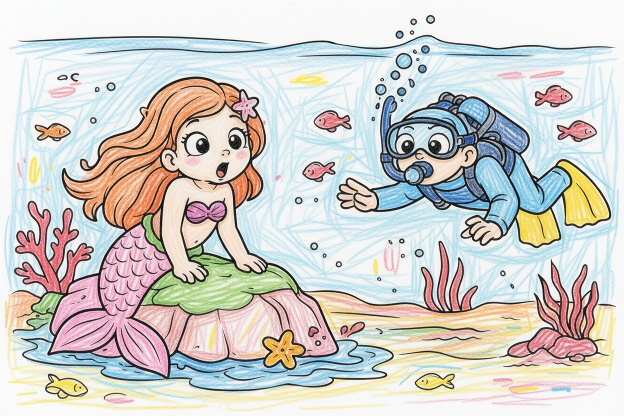 Printable coloring page for kids and toddlers showing a surprised mermaid meeting a scuba diver underwater. Big shapes and bold lines make it simple and fun for ages 1–5.