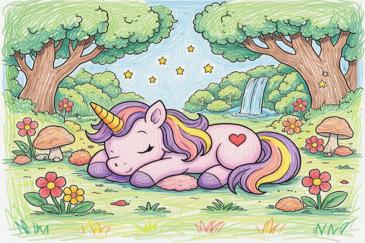 Simple printable coloring page for kids and toddlers with a sleeping unicorn in a magic forest. Big shapes, bold black lines, and a very simple scene make it perfect for ages 1–5.