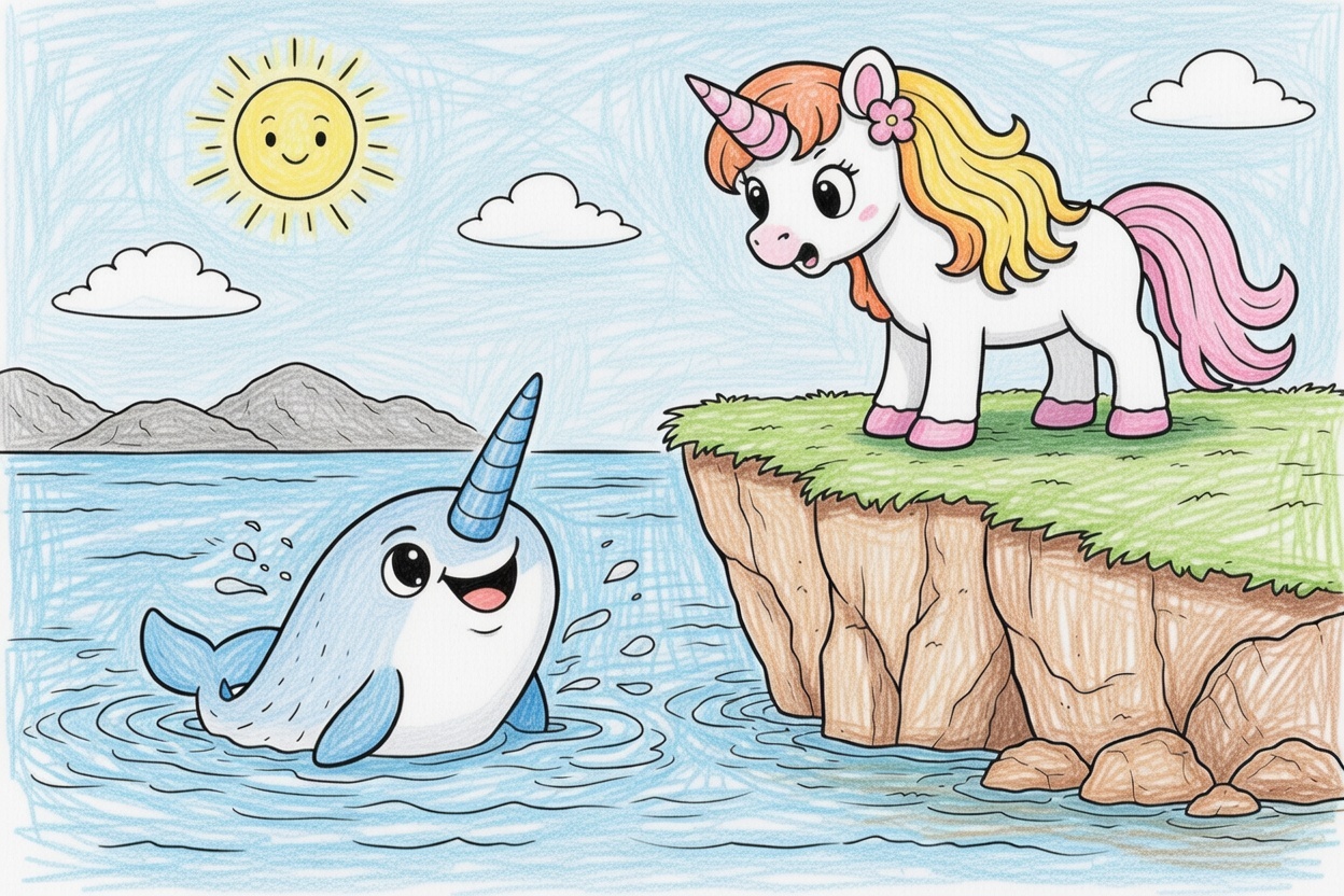 Printable coloring page for kids and toddlers showing a surprised unicorn on a cliff looking at a narwhal jumping from the water. Big shapes and bold outlines make this preschool coloring page easy to color.