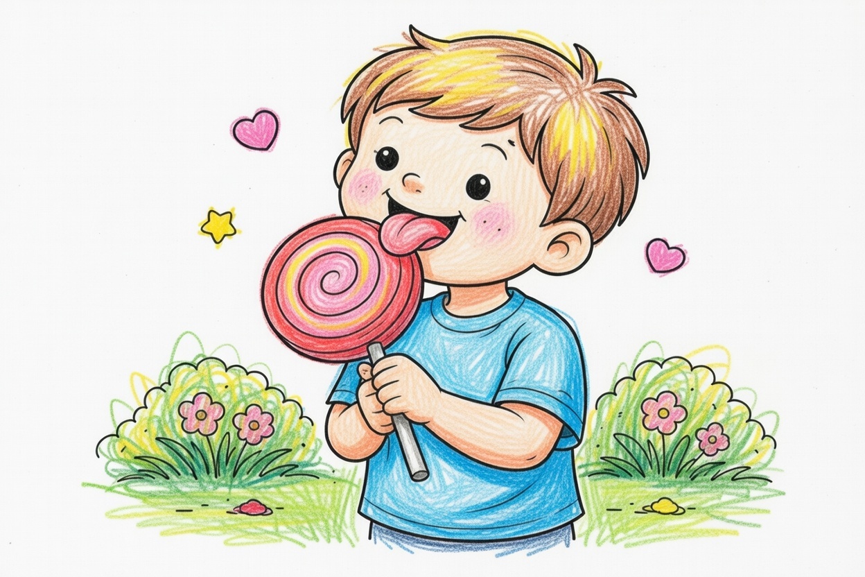 Simple printable coloring page for kids aged 1–5 showing a boy licking a big lollipop from the side. Very bold black lines, large shapes, and minimal details make it easy to color.
