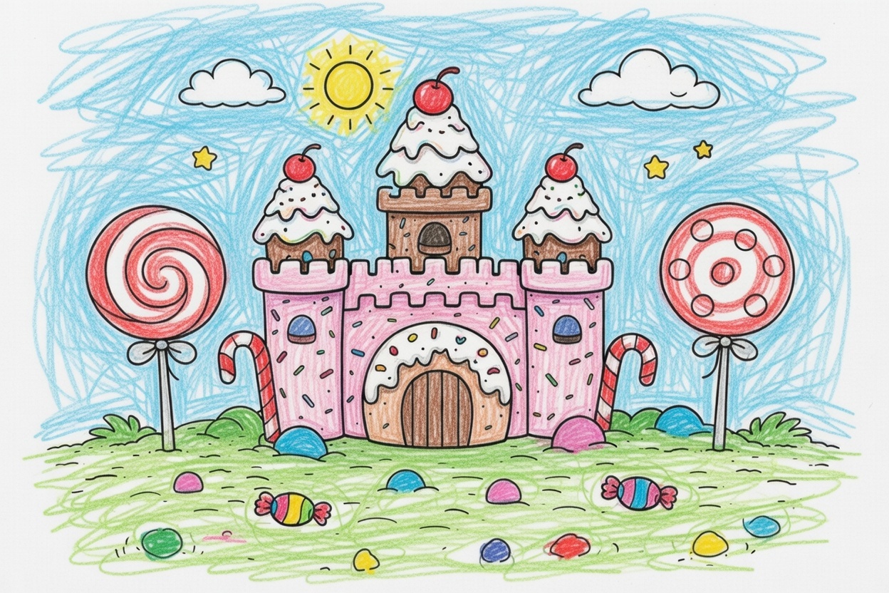Printable coloring page for kids and toddlers with a cute candy kingdom and a sweet castle made of treats. Big simple shapes and bold black lines make it easy and fun to color for ages 3–5.