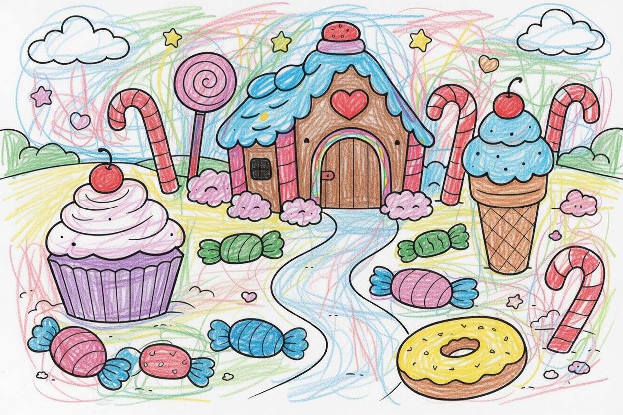 Printable coloring page for kids aged 1–5 with a simple candy land scene. Big sweets, clear shapes, and bold black outlines make it easy and fun for little hands to color.