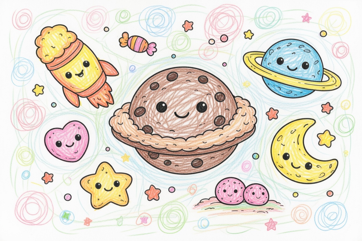 Printable coloring page for kids and toddlers with a cute cookie universe full of happy cookie planets and stars. Big simple shapes and bold black outlines make it easy to color for ages 1–5.