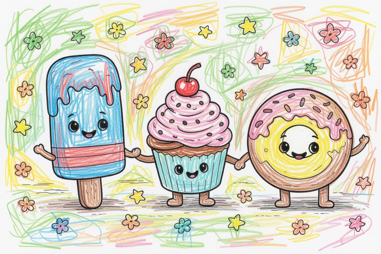 Printable coloring page for kids and toddlers with cute human-like sweets holding hands. Big shapes and bold black outlines make this simple coloring page perfect for preschool children.