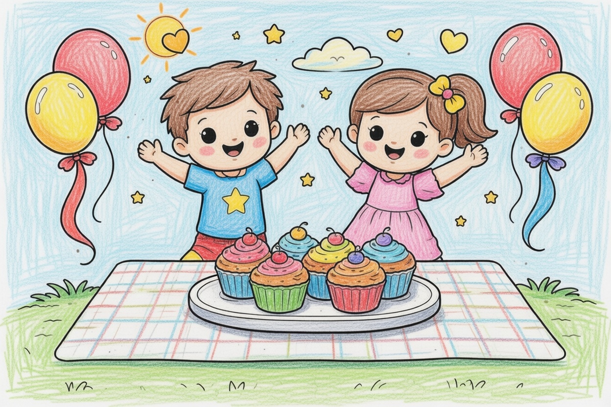 Printable coloring page for kids and toddlers showing a happy boy and girl enjoying cupcakes on a picnic blanket. Simple shapes and bold black outlines make it easy to color for ages 3–5.