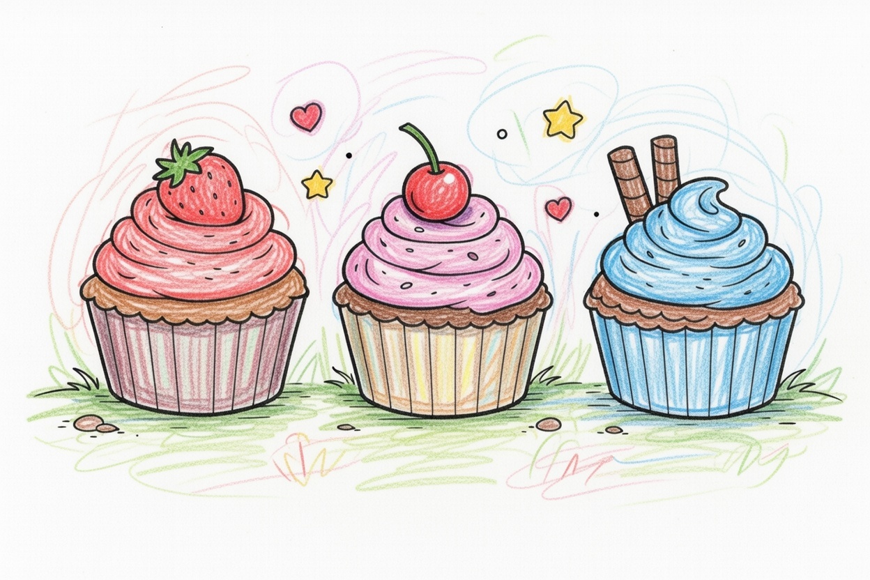 Printable coloring page for kids aged 3–5 with three simple cupcakes. Big shapes, clear bold black lines, and lots of open space make it easy and fun to color.