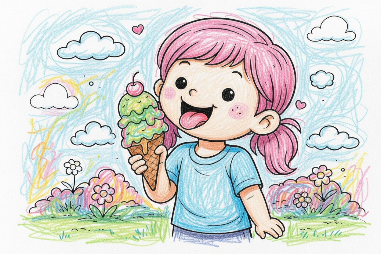 Printable coloring page for kids aged 1–5 showing a happy girl eating ice cream. Big shapes, clear black outlines, and a simple background make it easy and fun to color.