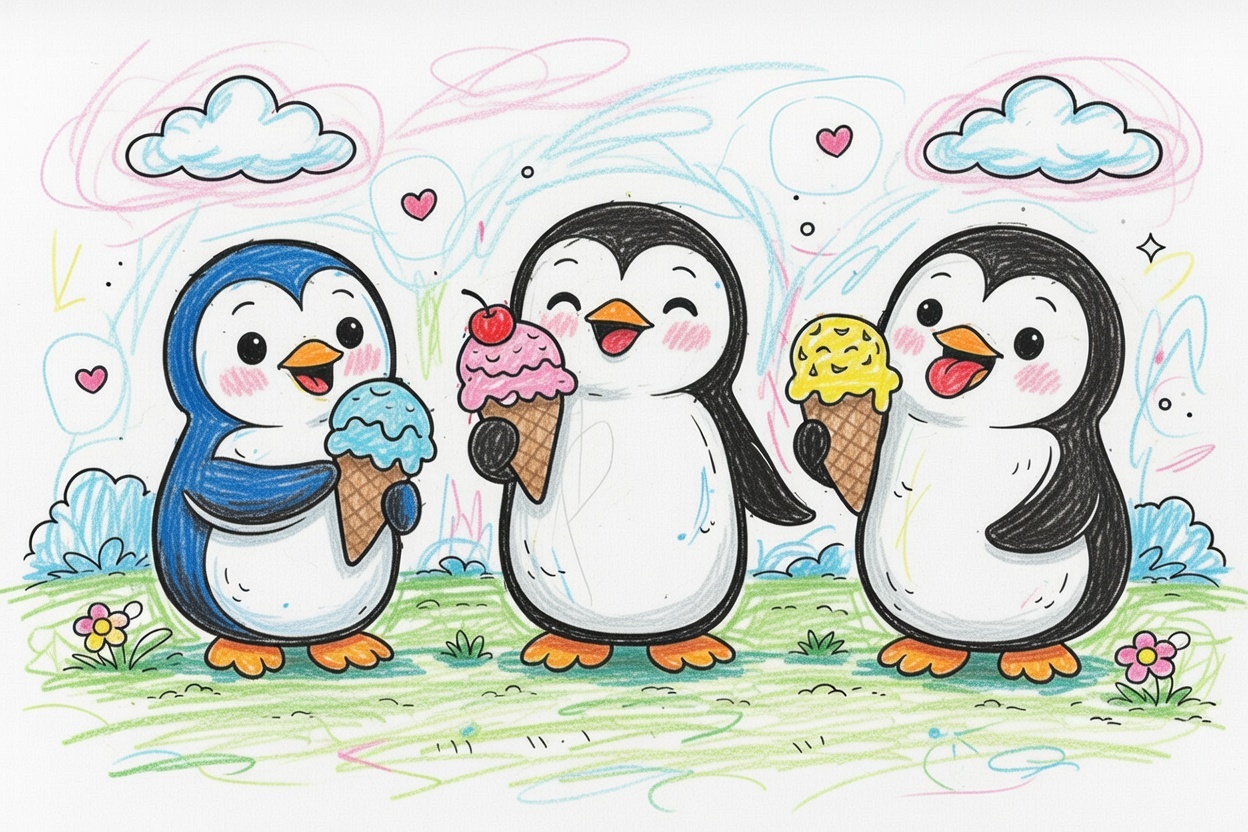 Printable coloring page for kids aged 1–5 with three cute penguins holding ice cream. Big shapes, bold black outlines, and a simple scene make it easy and fun to color.