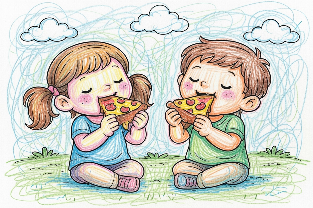 Printable coloring page for kids aged 1–5 showing two happy children eating pizza with joy. Big shapes, bold black outlines, and a simple scene make it easy and fun to color.