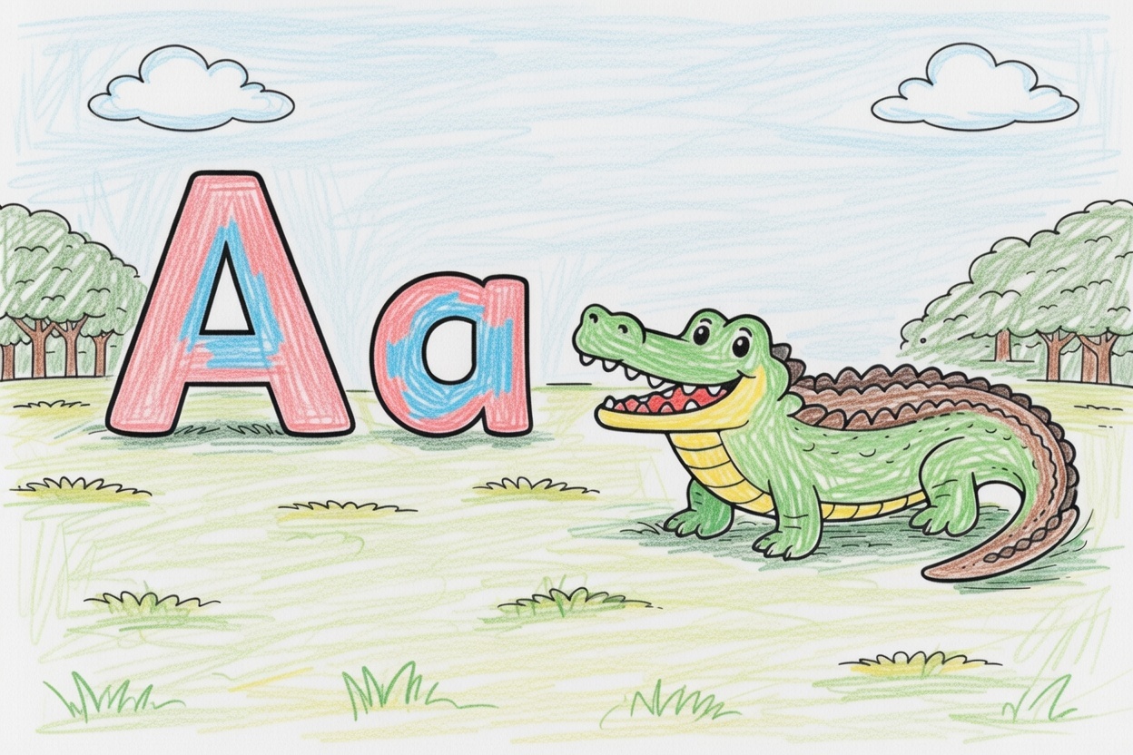 A fun printable coloring page for kids showing the big and small letter A with a friendly alligator. Simple shapes and bold outlines make it perfect for toddlers and preschoolers.