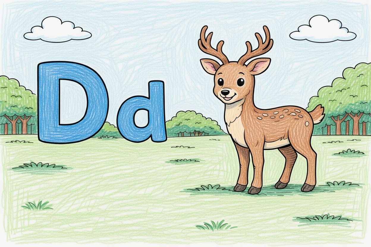 A cute printable coloring page for kids showing the big and small letter D with a friendly deer. Simple shapes and bold outlines make it perfect for toddlers and preschoolers.
