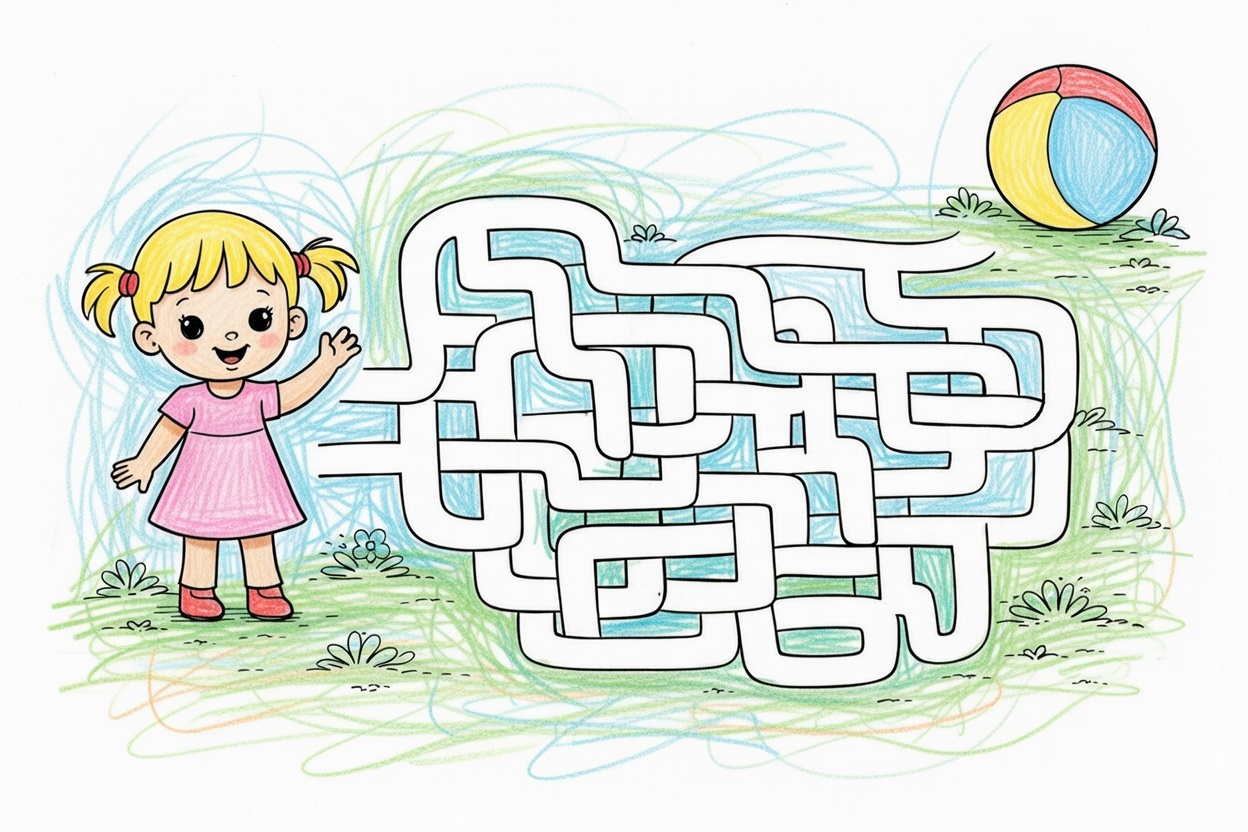 A printable maze coloring page where a little girl must find the correct path through the maze to reach her ball. Bold black lines and a fun winding path make it great for preschool kids.