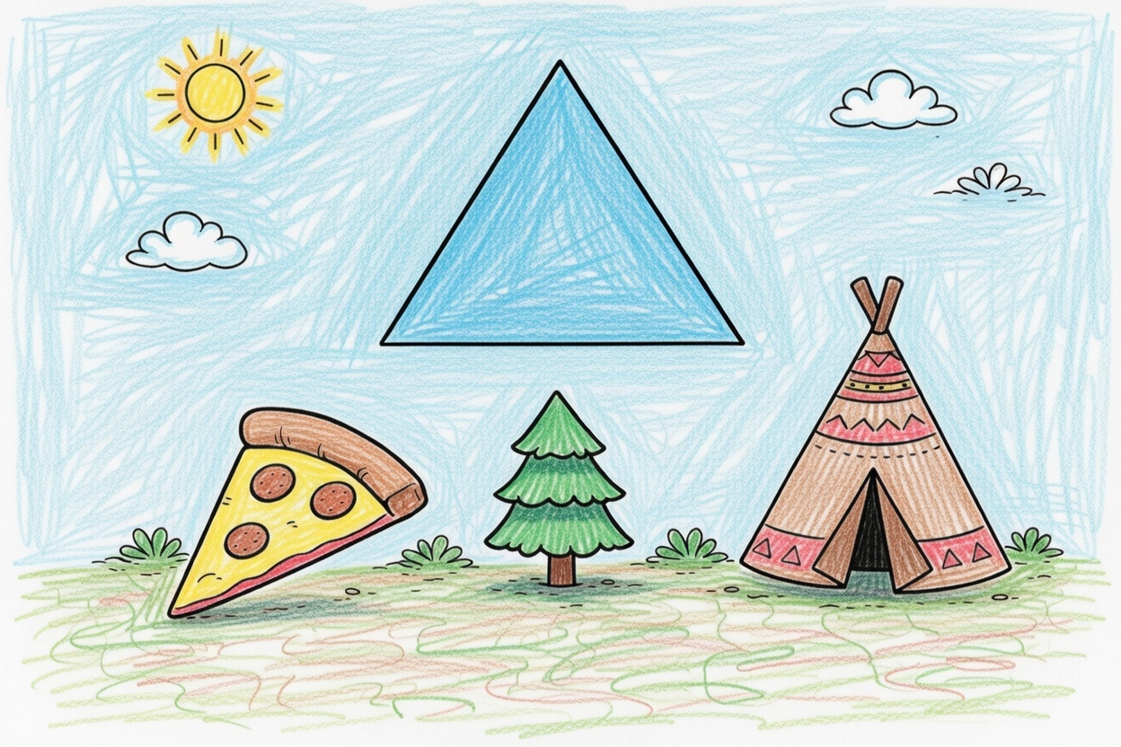 A printable coloring page designed to help kids learn the triangle shape. A big clear triangle and simple triangle-shaped objects make it easy and fun for toddlers and preschool children.