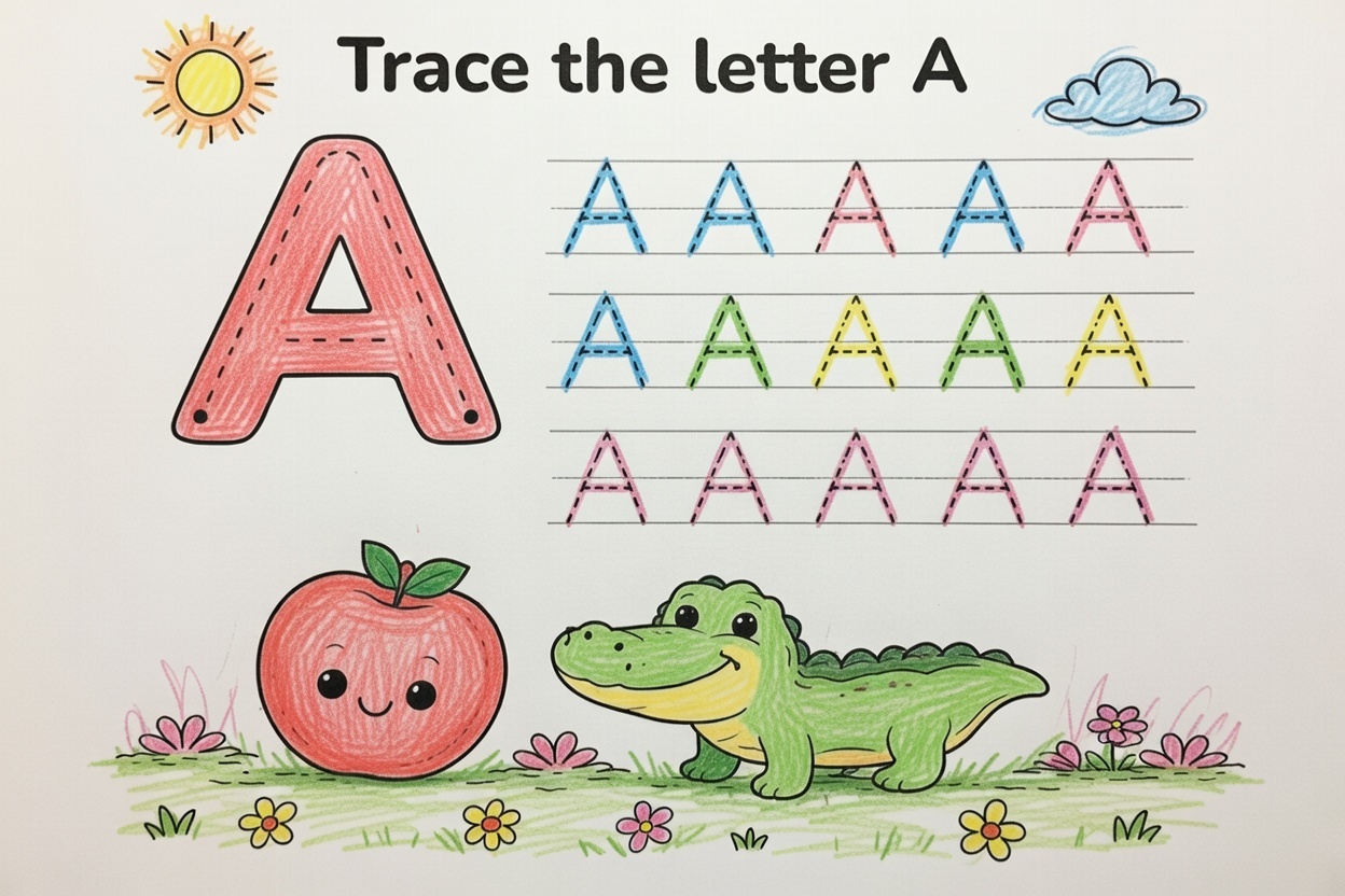 A simple printable tracing coloring page to help toddlers learn the letter A. Big dotted lines and friendly pictures make it easy and fun for kids ages 1–3.
