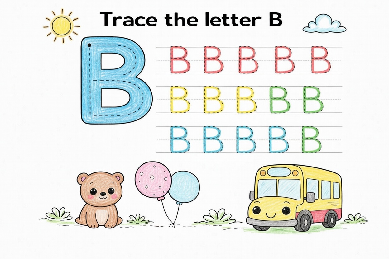 A printable tracing coloring page to help kids learn the uppercase letter B. Big dotted lines and simple pictures make it easy and fun for toddlers and preschool children.