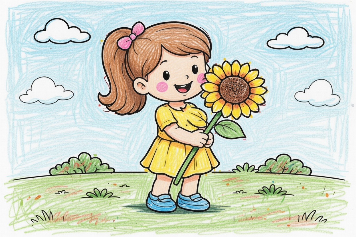 A sweet printable coloring page for kids showing a cute girl holding a big sunflower. Simple shapes and bold outlines make it perfect for toddlers and preschool coloring fun.