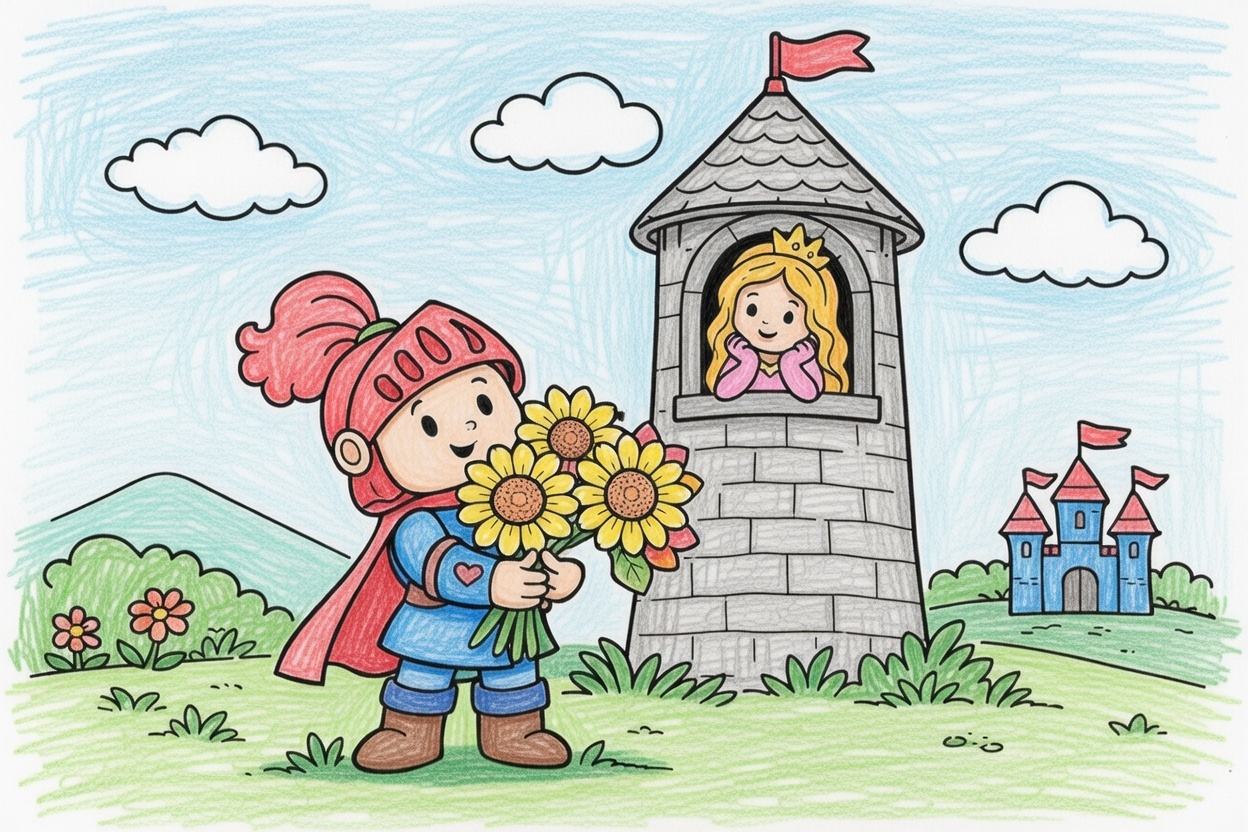A cute printable coloring page showing a friendly knight holding sunflowers under a tower window with a princess. Simple bold shapes make it perfect for toddlers and young kids ages 1–5.
