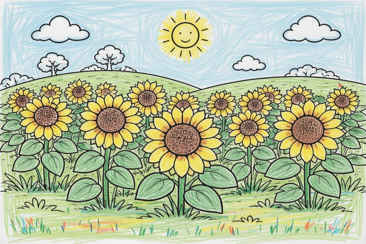 A cheerful printable coloring page for kids showing a wide field of sunflowers under a sunny sky. Big flowers and simple shapes make it perfect for toddlers and preschool coloring fun.
