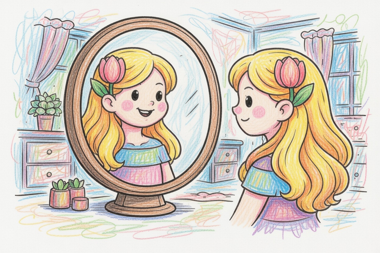 A gentle printable coloring page for toddlers showing a girl smiling at her reflection in a mirror, with a tulip in her hair. Simple shapes and bold lines make it easy and fun to color.