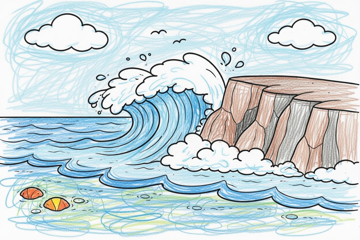 A printable coloring page showing big ocean waves crashing against a tall cliff. Bold lines and simple shapes make it fun and easy for kids and preschoolers to color.