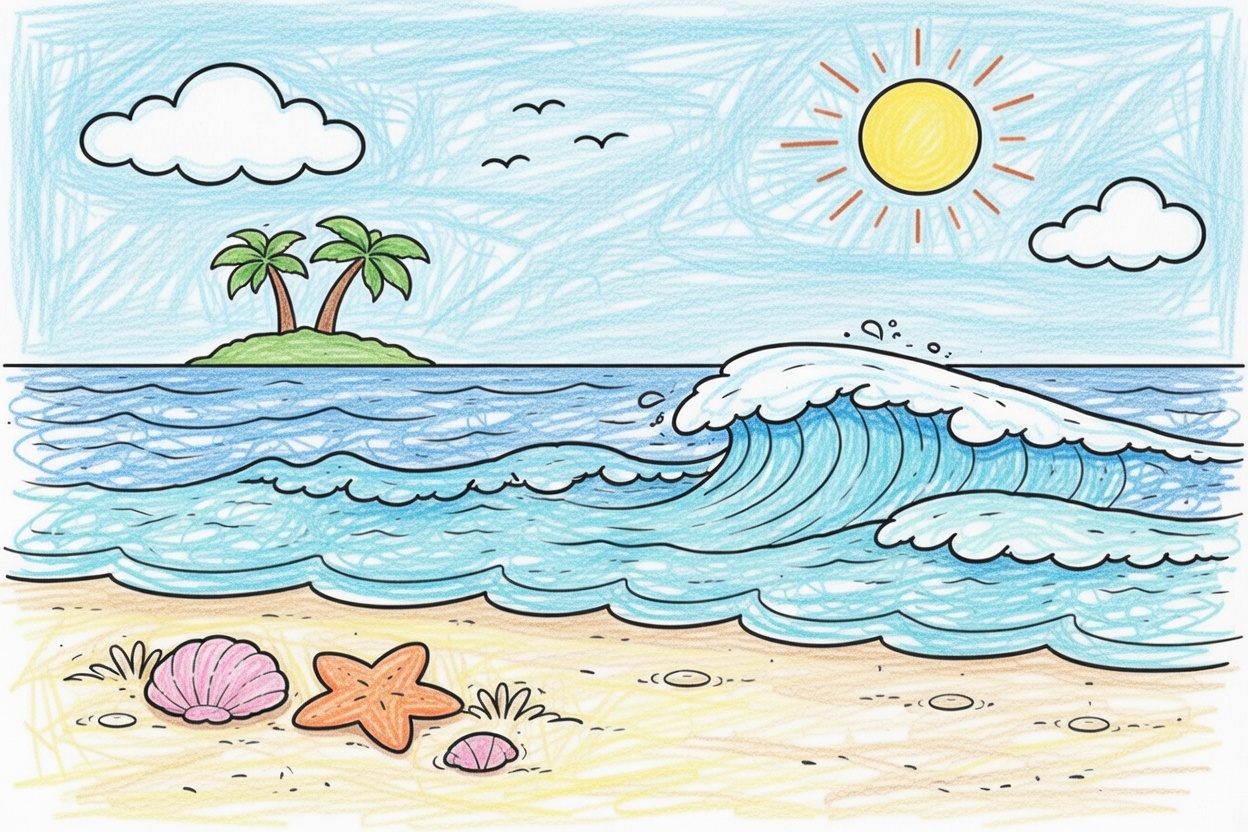 A simple printable coloring page showing the ocean with rolling waves, clouds, and the sun. Big clear shapes make it easy and relaxing for toddlers and preschool kids to color.