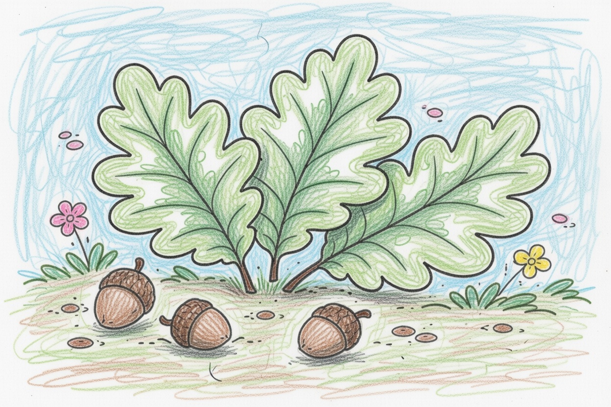 A printable coloring page with big oak leaves and acorns. Simple shapes and clear outlines make it easy and enjoyable for toddlers and preschool kids to color.