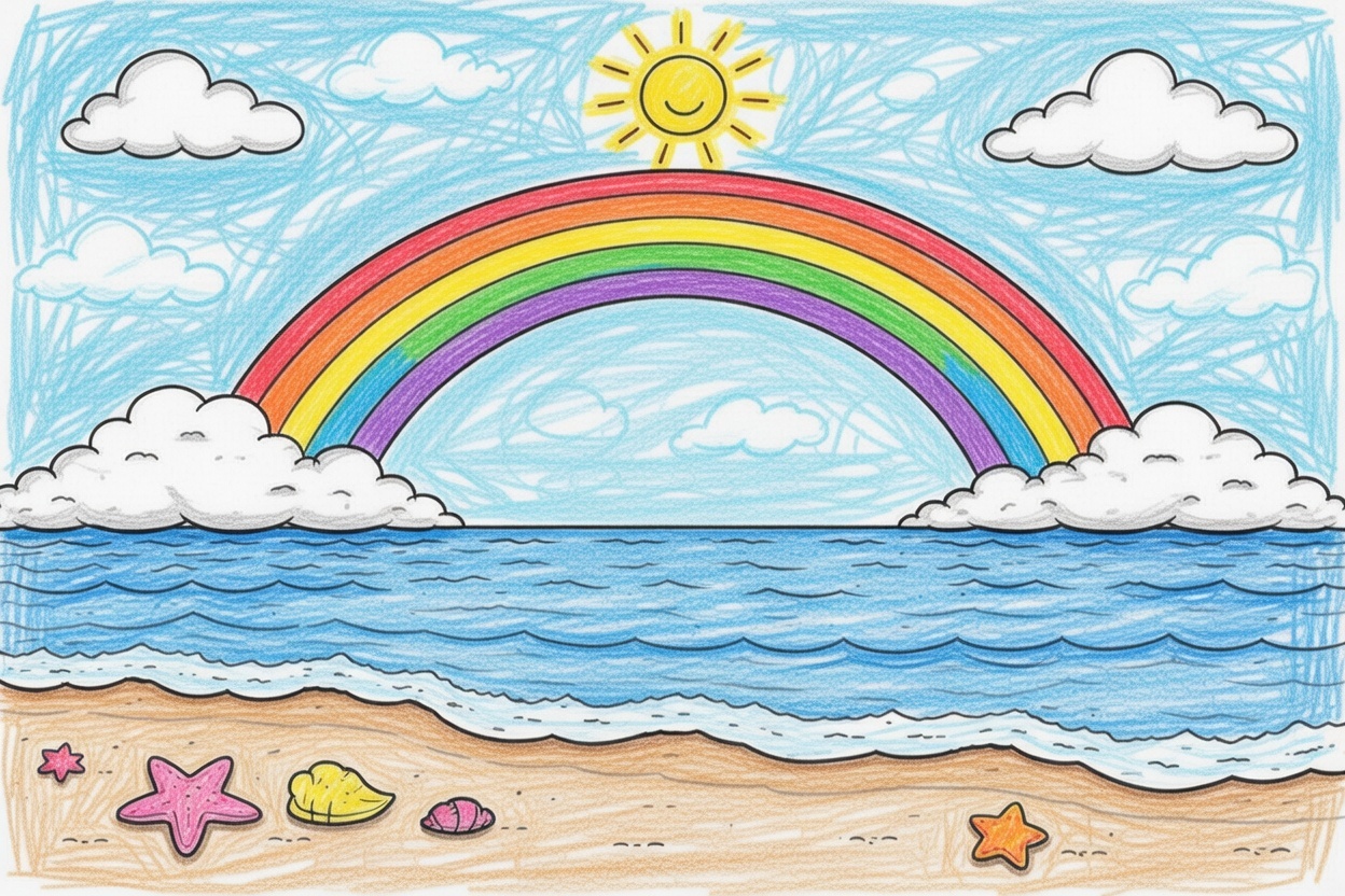 A calm printable coloring page for kids showing a beautiful rainbow over the sea with clouds and gentle waves. Big shapes and bold lines make it perfect for toddlers and preschoolers.